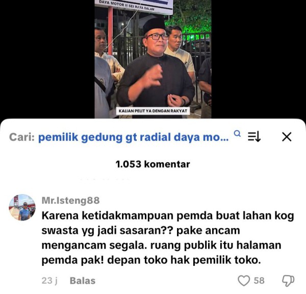 “Karena pemda tak mampu sediakan lahan, kok swasta yang disasar? Ruang publik itu halaman pemda, bukan depan toko orang,” kritik akun @Mr.Isteng88.