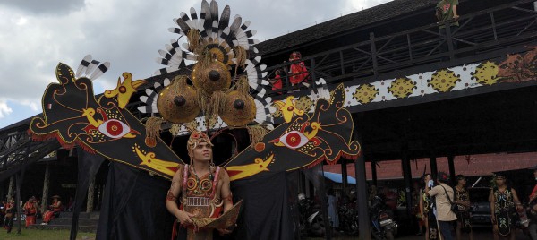 Peserta karnaval menggunakan pakaian khas Dayak lengkap dengan perlengkapan dan pernak-pernik Suku Dayak, seperti Mandau dan hiasan kepala berupa lawung atau sumping.