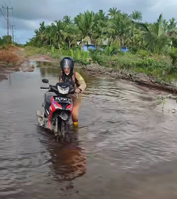 Saat hujan turun, kondisi jalan semakin parah. Lumpur lengket menutupi badan jalan, air menggenang di mana-mana, membuat sepeda motor sulit melaju. Tak jarang, Titin terpaksa turun dari motor dan menyeretnya perlahan agar tidak terperosok.